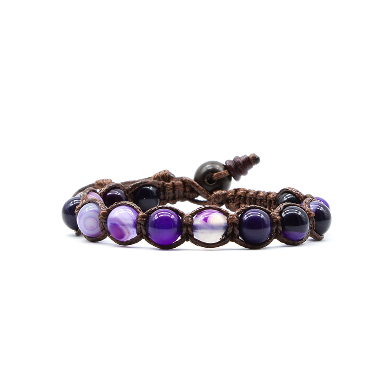 Bracciale Kenshò unisex realizzato con pietra Agata Viola Striata e cordoncino marrone. Pietra naturale 8 mm. Taglia unica, si adatta ad ogni tipo di polso.
