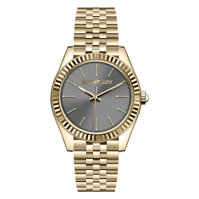 Freddy FW-005 da Donna ha cassa Acciaio di 30mm con cinturino in Acciaio Oro. Movimento Quarzo Solo Tempo e impermeabilità 3ATM